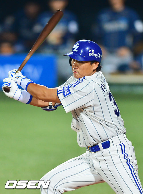 23일 오후 대구시민구장에서 열린 2013 한국야쿠르트 세븐프로야구 삼성 라이온즈와 NC 다이노스의 경기, 8회말 1사 주자 없는 상황에서 삼성 이승엽이 중견수 왼쪽 1루타를 날리고 있다.