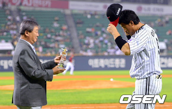 23일 오후 서울 잠실구장에서 열린 2013 한국야쿠르트 세븐프로야구 LG 트윈스와 KIA 타이거즈의 경기, 5회말 종료 후 클리닝 타임때 LG 이병규가 사이클링, 10연타석 안타 신기록 시상식을 갖고 KBO 구본능 총재에게 기념패를 전달받고 있다