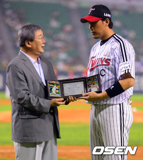 23일 오후 서울 잠실구장에서 열린 2013 한국야쿠르트 세븐프로야구 LG 트윈스와 KIA 타이거즈의 경기, 5회말 종료 후 클리닝 타임때 LG 이병규가 사이클링, 10연타석 안타 신기록 시상식을 갖고 KBO 구본능 총재에게 기념패를 전달받고 있다