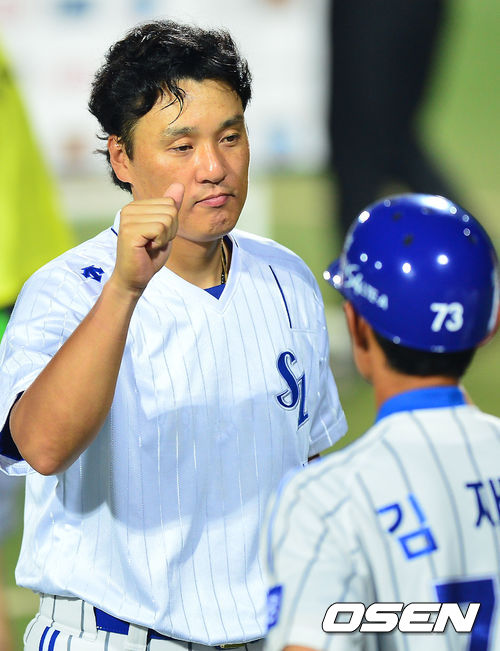 경기를 마치고 삼성 이승엽이 김재걸 코치와 하이파이브를 하고 있다. / rumi@osen.co.kr