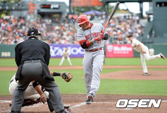 24일(한국시간) 미국 캘리포니아주 샌프란시스코에서 열린 2013 메이저리그 샌프란시스코 자이언츠와 신시내티 레즈의 경기, 2회말 무사에서 신시내티 추신수가 샌프란시스코 에릭 서캄프의 투구에 맞고 있다.