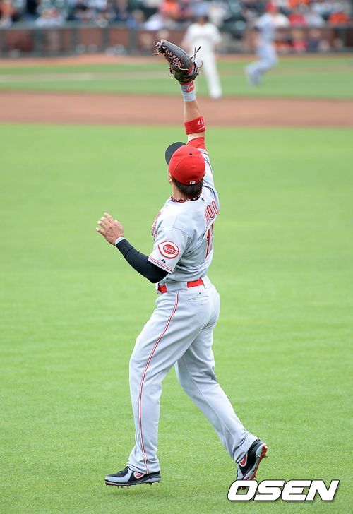 24일(한국시간) 미국 캘리포니아주 샌프란시스코에서 열린 2013 메이저리그 샌프란시스코 자이언츠와 신시내티 레즈의 경기, 1회말 1사 3루에서 신시내티 추신수가 샌프란시스코 산도발의 타구를 잡아내고 있다.