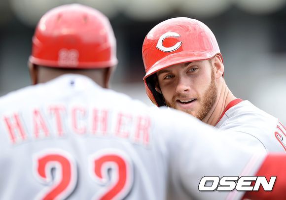24일(한국시간) 미국 캘리포니아주 샌프란시스코에서 열린 2013 메이저리그 샌프란시스코 자이언츠와 신시내티 레즈의 경기, 3회초 2사 1,3루에서 신시내티 싱그라니가 좌전 적시타를 치고 해처 코치와 하이파이브를 하고 있다.