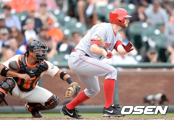 24일(한국시간) 미국 캘리포니아주 샌프란시스코에서 열린 2013 메이저리그 샌프란시스코 자이언츠와 신시내티 레즈의 경기, 3회초 2사 1,3루에서 신시내티 싱그라니가 좌전 적시타를 치고 있다.
