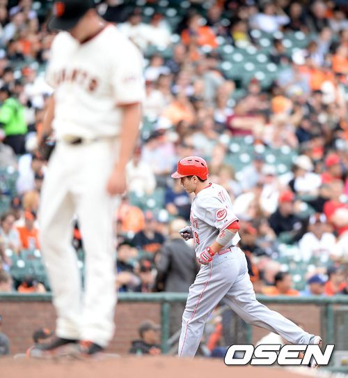 24일(한국시간) 미국 캘리포니아주 샌프란시스코에서 열린 2013 메이저리그 샌프란시스코 자이언츠와 신시내티 레즈의 경기, 3회초 무사에서 신시내티 보토가 중월 솔로 홈런을 치고 그라운드를 돌고 있다.