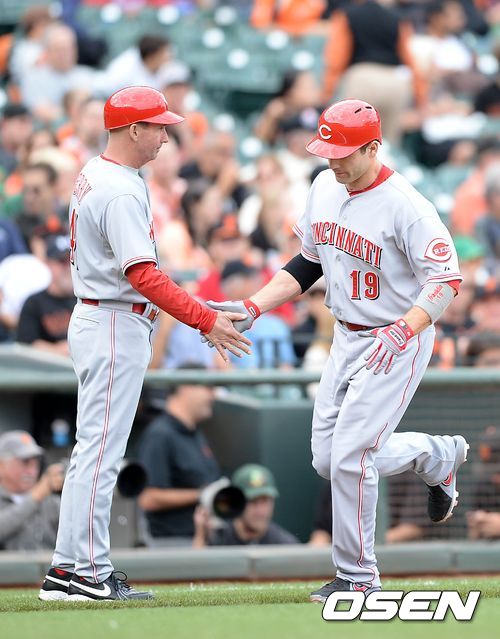24일(한국시간) 미국 캘리포니아주 샌프란시스코에서 열린 2013 메이저리그 샌프란시스코 자이언츠와 신시내티 레즈의 경기, 3회초 무사에서 신시내티 보토가 중월 솔로 홈런을 치고 그라운드를 돌고 있다.