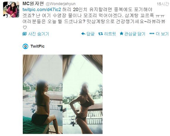 또 원자현은 "허리 20인치 유지할려면 중복에도 포기해야겠죠?"라며 "난 여기 수영장 물이나 모조리 먹어야겠다"라고 적었다. 이어 "삼계탕 꼬르륵 ㅠㅠ 여러분들은 오늘 뭘 드셨나요? 맛삼계탕으로 건강챙기세요~ 라뷰라뷰♡"라고 덧붙였다.