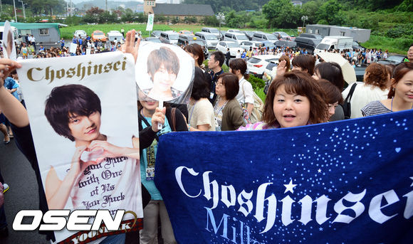 팬들이 플랜카드를 들고 윤학을 기다리고 있다.