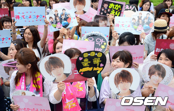 팬들이 플랜카드를 들고 윤학을 기다리고 있다.