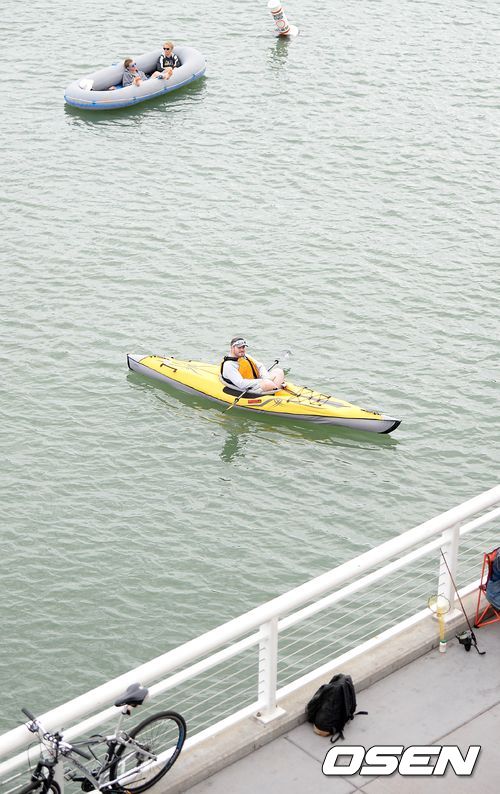 24일(한국시간) 미국 캘리포니아주 샌프란시스코에서 열린 2013 메이저리그 샌프란시스코 자이언츠와 신시내티 레즈의 경기, 경기에 앞서 야구팬들이 작은 배를 타고 홈런 타구를 기다리고 있다.
