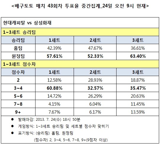 [배구토토] 국민체육진흥공단(www.kspo.or.kr)이 발행하는 체육진흥투표권 수탁사업자인 스포츠토토의 공식 온라인 발매사이트 베트맨(www.betman.co.kr)은 오는 25일 안산 상록수체육관에서 열리는 2013 KOVO컵 현대캐피탈-삼성화재전을 대상으로 하는 배구토토 매치 43회차 게임 투표율 중간집계 결과, 배구팬들은 삼성화재가 현대캐피탈을 상대로 우세한 경기를 펼칠 것으로 예상했다.