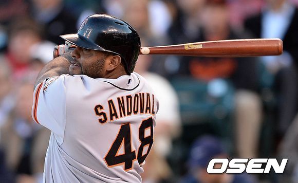 24일(한국시간) 미국 캘리포니아주 샌프란시스코에서 열린 2013 메이저리그 샌프란시스코 자이언츠와 신시내티 레즈의 더블 헤더 경기 2차전, 1회초 1사 1,2루에서 샌프란시스코 산도발이 좌전 2타점 적시타를 치고 있다.