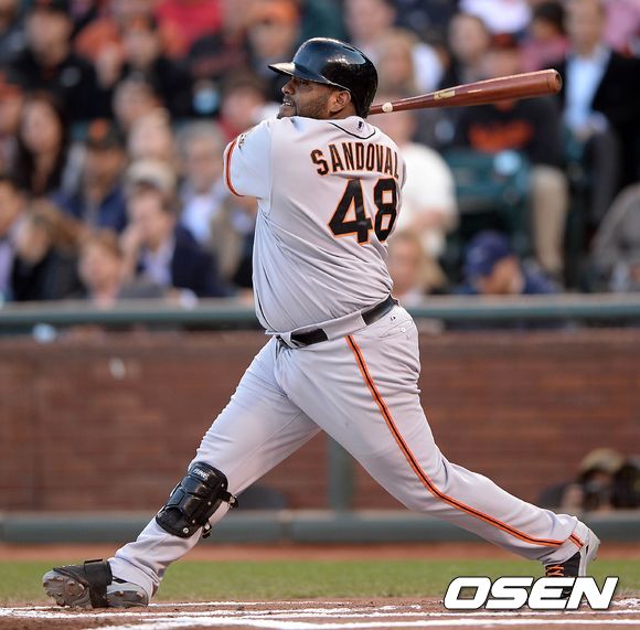 24일(한국시간) 미국 캘리포니아주 샌프란시스코에서 열린 2013 메이저리그 샌프란시스코 자이언츠와 신시내티 레즈의 더블 헤더 경기 2차전, 1회초 1사 1,2루에서 샌프란시스코 산도발이 좌전 2타점 적시타를 치고 있다.