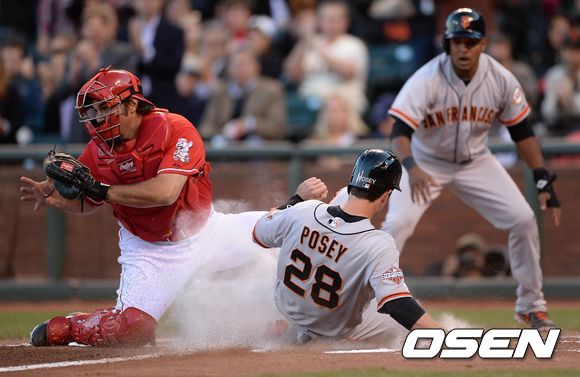 24일(한국시간) 미국 캘리포니아주 샌프란시스코에서 열린 2013 메이저리그 샌프란시스코 자이언츠와 신시내티 레즈의 더블 헤더 경기 2차전, 1회초 1사 1,2루에서 샌프란시스코 산도발의 좌전 2타점 적시타 때 1루주자 포지가 홈에서 세이프 되고 있다.