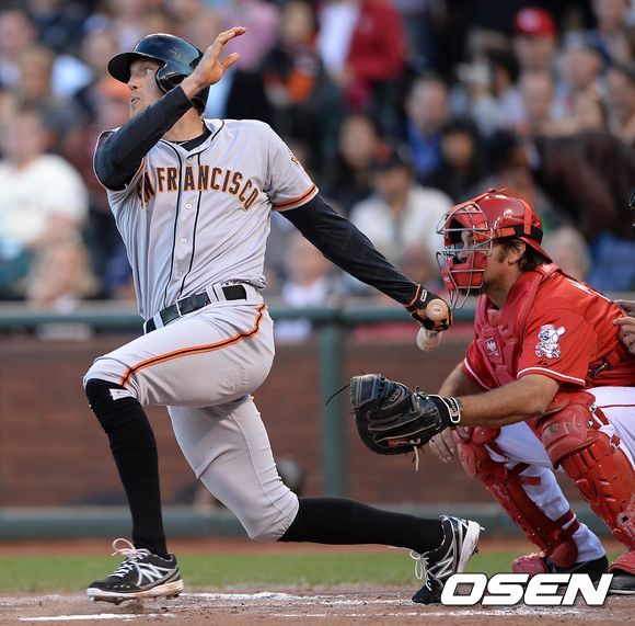 24일(한국시간) 미국 캘리포니아주 샌프란시스코에서 열린 2013 메이저리그 샌프란시스코 자이언츠와 신시내티 레즈의 더블 헤더 경기 2차전, 1회초 1사 2루에서 샌프란시스코 펜스가 중전 적시타를 치고 있다.