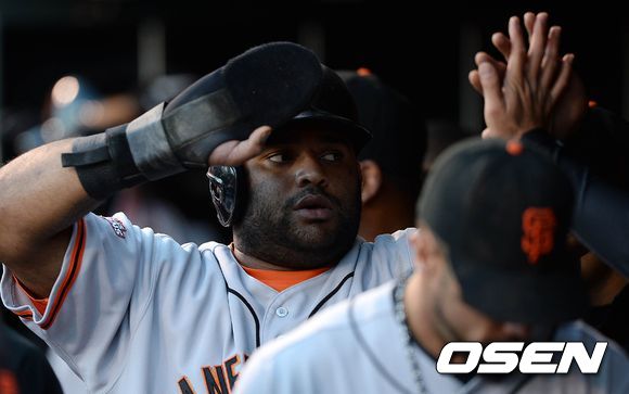 24일(한국시간) 미국 캘리포니아주 샌프란시스코에서 열린 2013 메이저리그 샌프란시스코 자이언츠와 신시내티 레즈의 더블 헤더 경기 2차전, 1회초 1사 2루에서 샌프란시스코 펜스의 중전 적시타 때 홈을 밟은 2루주자 산도발이 덕아웃에서 동료들과 환호하고 있다.