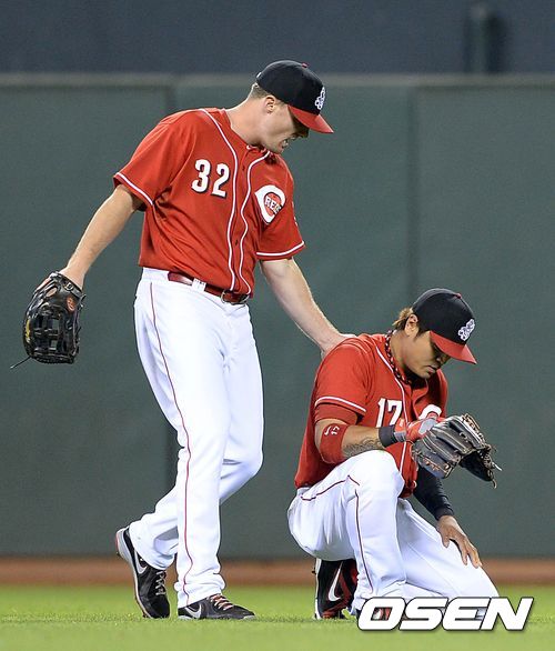24일(한국시간) 미국 캘리포니아주 샌프란시스코에서 열린 2013 메이저리그 샌프란시스코 자이언츠와 신시내티 레즈의 더블 헤더 경기 2차전, 5회초 1사 1,2루에서 신시내티 브루스가 샌프란시스코 펜스의 타구를 놓친 추신수를 격려하고 있다.