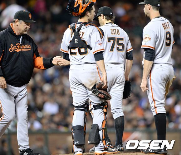 24일(한국시간) 미국 캘리포니아주 샌프란시스코에서 열린 2013 메이저리그 샌프란시스코 자이언츠와 신시내티 레즈의 더블 헤더 경기 2차전, 5회말 2사 3루에서 샌프란시스코 지토가 마운드를 내려가고 있다.