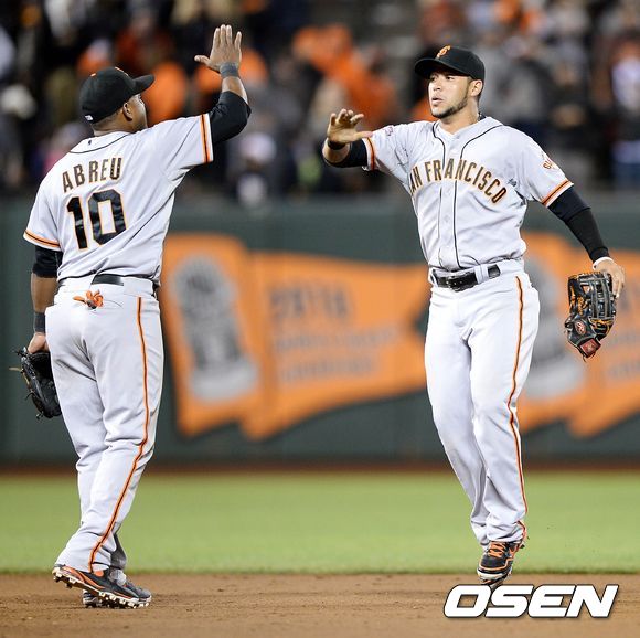9회말 2사 2루에서 샌프란시스코 선수들이 승리의 기쁨을 나누고 있다. /sunday@osen.co.kr