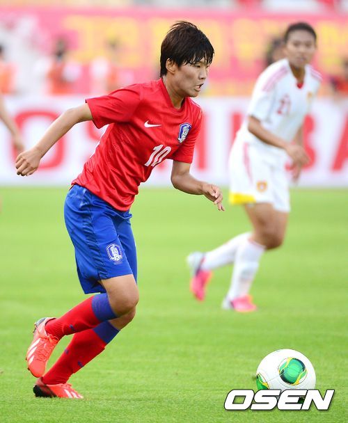 24일 오후 경기도 화성종합경기타운에서 열린 2013 동아시안컵 축구선수권대회 여자부 2차전 한국과 중국의 경기, 전반 한국 지소연이 드리블을 하고 있다.