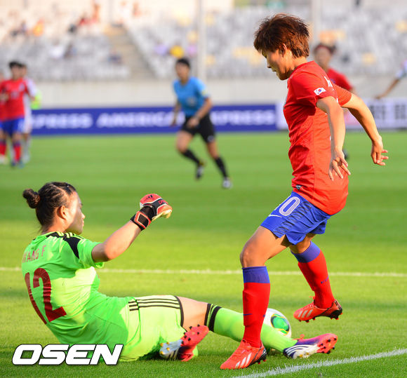 24일 오후 경기도 화성종합경기타운에서 열린 2013 동아시안컵 축구선수권대회 여자부 2차전 한국과 중국의 경기, 후반 지소연이 중국 왕페이 골키퍼를 일대일 찬스에서 슛찬스를 놓치고 있다.