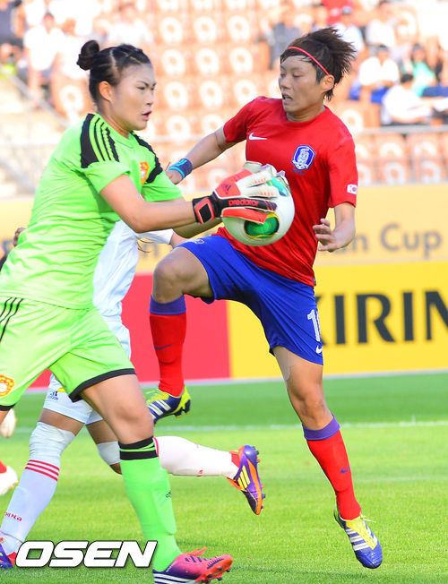 24일 오후 경기도 화성종합경기타운에서 열린 2013 동아시안컵 축구선수권대회 여자부 2차전 한국과 중국의 경기, 후반 차연희가 중국 문전에서 볼을 놓치고 있다