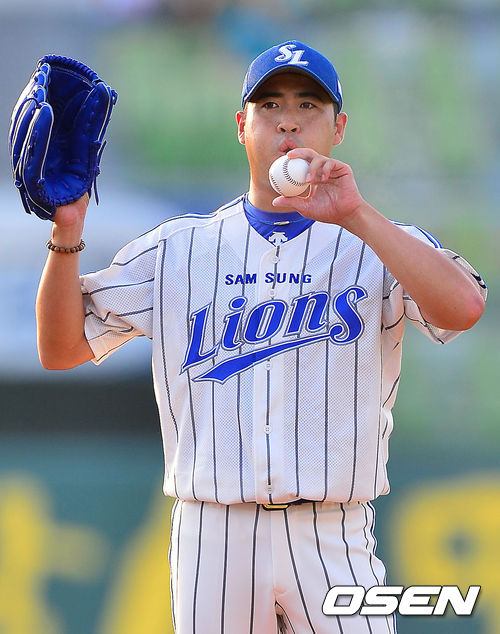 24일 오후 대구시민구장에서 열린 2013 한국야쿠르트 세븐프로야구 삼성 라이온즈와 NC 다이노스의 경기, 삼성 선발 장원삼이 볼과 손의 로진가루를 불고 있다.