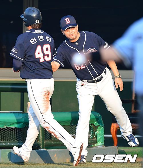 24일 오후 서울 목동야구장에서 '2013 한국야쿠르트 세븐 프로야구' 넥센 히어로즈 대 두산 베어스의 경기가 열렸다. 1회초 1사 1, 3루 상황 넥센 선발 강윤구의 폭투 때 3루주자 민병헌이 홈을 밟은 뒤 김진욱 감독과 인사를 나누고 있다.