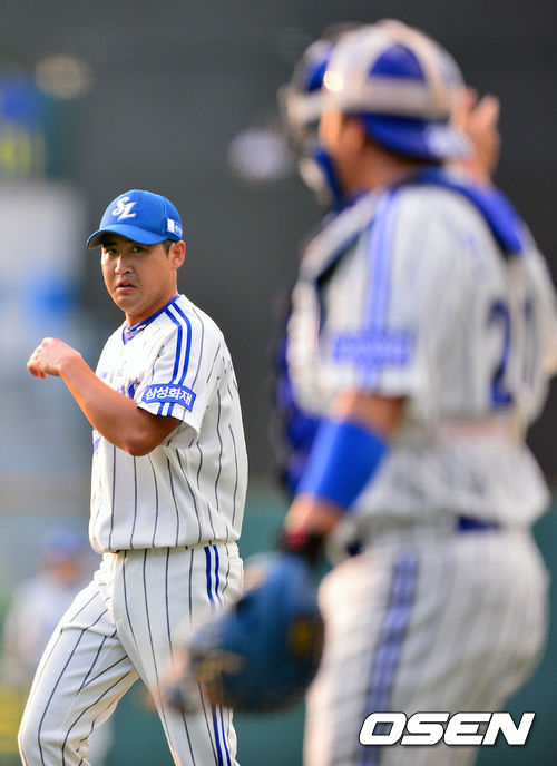 24일 오후 대구시민구장에서 열린 2013 한국야쿠르트 세븐프로야구 삼성 라이온즈와 NC 다이노스의 경기, 1회초를 마치고 삼성 선발 장원삼이 진갑용 포수와 얘기를 나누며 덕아웃으로 향하고 있다.