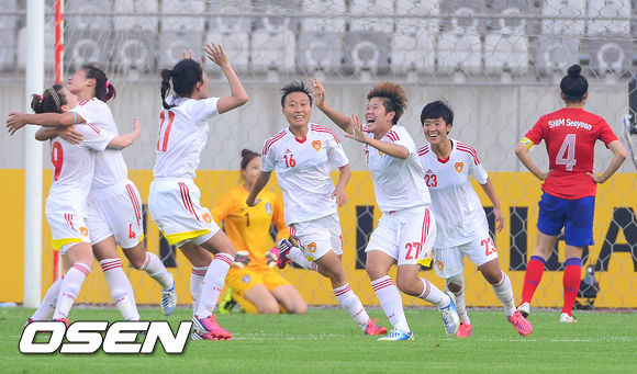 24일 오후 경기도 화성종합경기타운에서 열린 2013 동아시안컵 축구선수권대회 여자부 2차전 한국과 중국의 경기, 후반 중국 리잉이 추가골을 넣고 동료들과 환호하고 있다