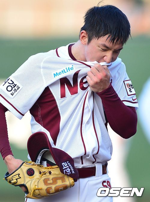 24일 오후 서울 목동야구장에서 '2013 한국야쿠르트 세븐 프로야구' 넥센 히어로즈 대 두산 베어스의 경기가 열렸다. 1회초 두산 공격 때 4실점한 넥센 선발 강윤구가 이닝을 마치고 더그아웃으로 들어오며 땀을 닦고 있다.