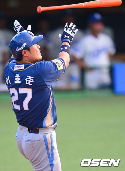 24일 오후 대구시민구장에서 열린 2013 한국야쿠르트 세븐프로야구 삼성 라이온즈와 NC 다이노스의 경기, 2회초 선두타자 이호준이 초구를 노려 중월쪽 큰 타구를 날렸으나 중견수 플라이아웃 되고 있다.