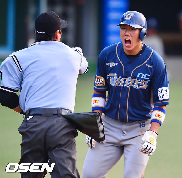 24일 오후 대구시민구장에서 열린 2013 한국야쿠르트 세븐프로야구 삼성 라이온즈와 NC 다이노스의 경기, 2회초 2사 주자 2루 NC 이현곤의 좌익수 앞 안타때 2루주자 모창민이 홈으로 쇄도하였으나 삼성 진갑용에게 태그아웃을 당한 후 강광회 구심에게 아웃 판정을 받으며 아쉬워하고 있다.
