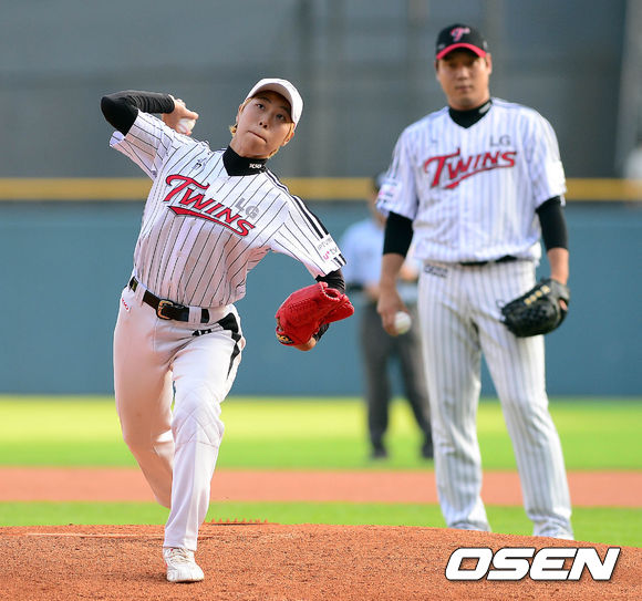 24일 오후 서울 잠실구장에서 열린 '2013 한국야쿠르트 세븐 프로야구' LG 트윈스와 KIA 타이거즈의 경기 시작전 LG배 한국 여자 야구 대회 MVP 이민정이 시구를 하고 있다.