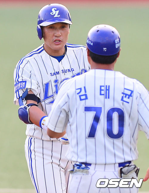 24일 오후 대구시민구장에서 열린 2013 한국야쿠르트 세븐프로야구 삼성 라이온즈와 NC 다이노스의 경기, 2회말 선두타자 삼성 이승엽이 우중간 2루타를 날린 후 2루에서 김태균 코치와 하이파이브를 하고 있다.