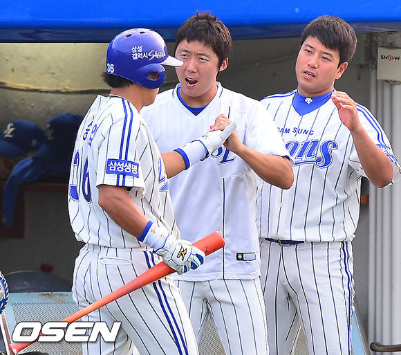 24일 오후 대구시민구장에서 열린 2013 한국야쿠르트 세븐프로야구 삼성 라이온즈와 NC 다이노스의 경기, 2회말 1사 주자 3루 삼성 박석민이 우익수 앞 1타점 선취 적시타때 홈을 밟은 이승엽이 덕아웃에서 배영수와 하이파이브를 하고 있다.