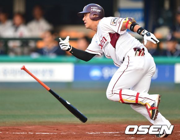 24일 오후 서울 목동야구장에서 '2013 한국야쿠르트 세븐 프로야구' 넥센 히어로즈 대 두산 베어스의 경기가 열렸다. 1회말 넥센 공격1사 만루 상황 김민성이 추격의 2타점 중전 적시타를 날리고 있다.