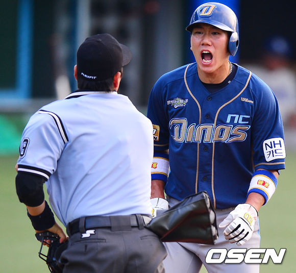24일 오후 대구시민구장에서 열린 2013 한국야쿠르트 세븐프로야구 삼성 라이온즈와 NC 다이노스의 경기, 2회초 2사 주자 2루 NC 이현곤의 좌익수 앞 안타때 2루주자 모창민이 홈으로 쇄도하였으나 삼성 진갑용에게 태그아웃을 당한 후 강광회 구심에게 아웃 판정을 받으며 아쉬워하고 있다.