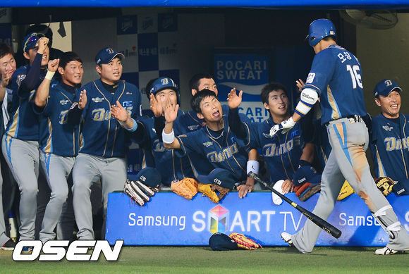 24일 오후 대구시민구장에서 열린 2013 한국야쿠르트 세븐프로야구 삼성 라이온즈와 NC 다이노스의 경기, 4회초 1사 주자 1루 NC 모창민이 중월 역전 투런홈런을 날린 후 덕아웃에서 동료들과 하이파이브를 하고 있다.