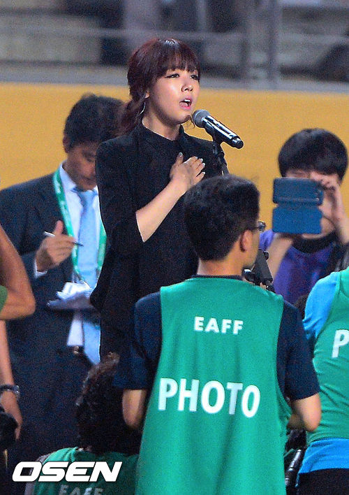 24일 오후 화성종합경기타운에서 열린 2013 동아시안컵 축구선수권대회 남자부 2차전 한국과 중국의 경기에 앞서 걸스데이 민아가 애국가를 제창하고 있다