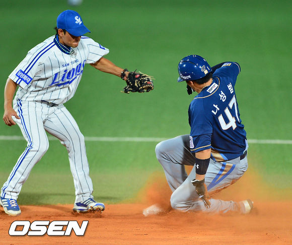 24일 오후 대구시민구장에서 열린 2013 한국야쿠르트 세븐프로야구 삼성 라이온즈와 NC 다이노스의 경기, 6회초 무사 주자 1루 NC 이호준 타석에서 1루 주자 나성범이 2루 도루에 성공하고 있다.