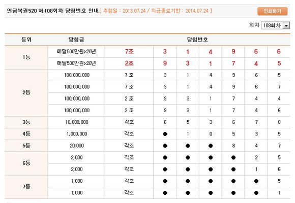 [OSEN=이슈팀] 20년 동안 매월 500만 원씩 받게 되는 연금복권520 제108회차 1등 당첨번호가 발표됐다.