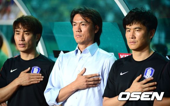 경기에 앞서 김태영 코치, 홍명보 감독, 박건하 코치가 국민의례를 하고 있다.