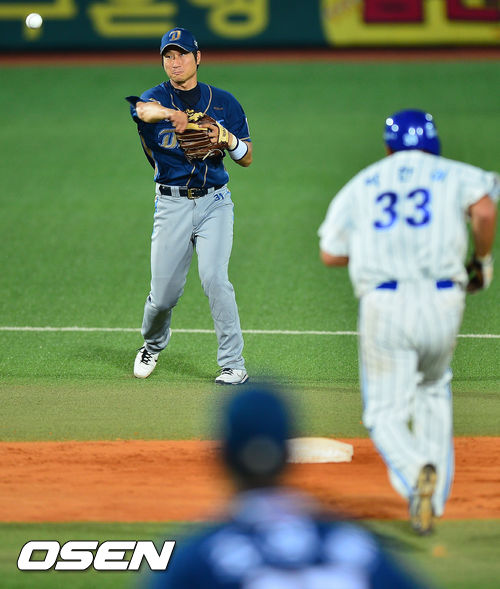 24일 오후 대구시민구장에서 열린 2013 한국야쿠르트 세븐프로야구 삼성 라이온즈와 NC 다이노스의 경기, 6회말 2사 주자 1루 삼성 이승엽의 땅볼 타구때 NC 유격수 이현곤이 1루로 송구하고 있다.