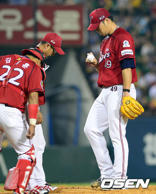 24일 오후 서울 잠실구장에서 열린 '2013 한국야쿠르트 세븐 프로야구' LG 트윈스와 KIA 타이거즈의 경기 4회말 김진우가 조규제 코치와 이야기를 나누고 있다.