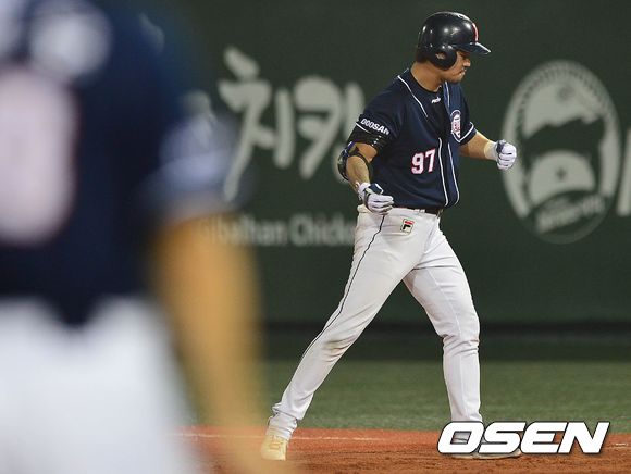 24일 오후 서울 목동야구장에서 '2013 한국야쿠르트 세븐 프로야구' 넥센 히어로즈 대 두산 베어스의 경기가 열렸다. 5회초 두산 공격 무사 1, 3루 상황 6번타자 오재원이 1타점 중전 적시타를 날리고 환호하고 있다.