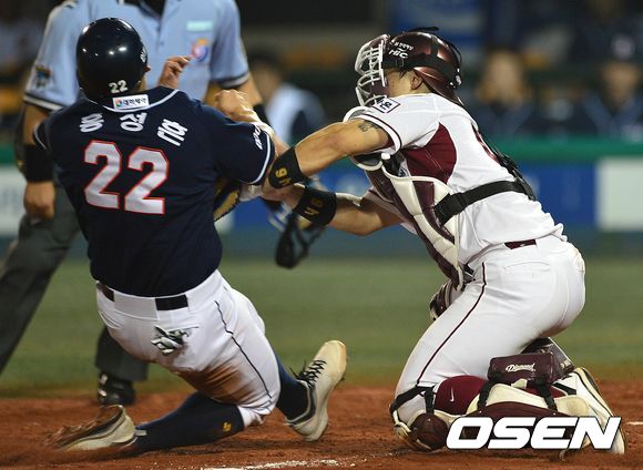 24일 오후 서울 목동야구장에서 '2013 한국야쿠르트 세븐 프로야구' 넥센 히어로즈 대 두산 베어스의 경기가 열렸다. 5회초 두산 공격 1사 2, 3루 상황 8번타자 최재훈의 좌익수 플라이 때 넥센 포수 박동원이 3루에서 태그업한 주자 홍성흔을 멋지게 잡아내고 있다.