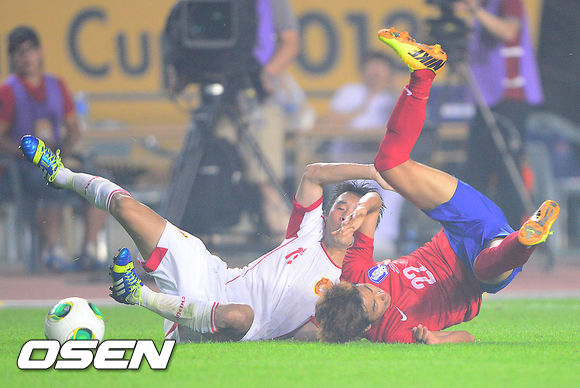 24일 오후 화성종합경기타운에서 열린 2013 동아시안컵 축구선수권대회 남자부 2차전 한국과 중국의 경기 전반 윤일록이 중국 선수의 태클에 걸려 넘어지고 있다