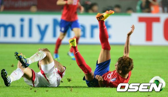 전반 한국 윤일록이 중국 수비수에 걸려 넘어지고 있다.