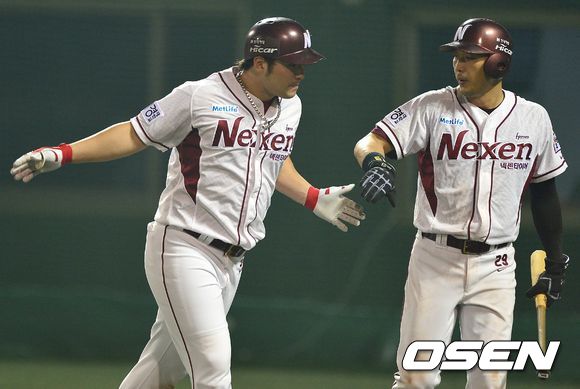 24일 오후 서울 목동야구장에서 '2013 한국야쿠르트 세븐 프로야구' 넥센 히어로즈 대 두산 베어스의 경기가 열렸다. 5회말 넥센 공격 무사 2루 상황 4번타자 박병호가 추격의 좌월 투런포를 날리고 홈베이스를 밟은 뒤 이택근과 인사를 나누고 있다.